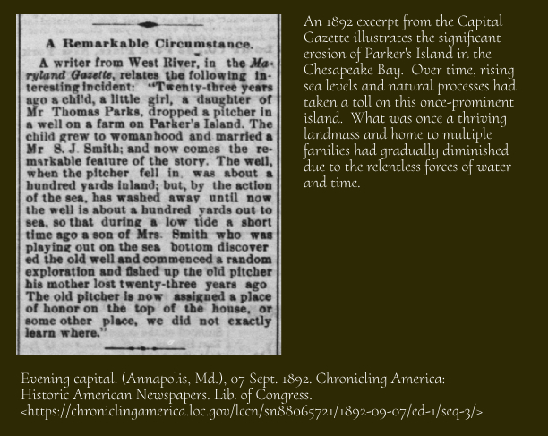 During the 1850s, watermen from Eastern Shore emigrated to nearby Parker's Island in search of new oyster beds. There, they had discovered the Bay Shore Bar, a huge natural oyster reef that was one of the largest and most productive oyster beds in the Chesapeake Bay at the time. Unfortunately, it was not long after their arrival that they realized the island was eroding away, and by 1890, it had been mostly destroyed by storms. The eight watermen and their families were forced to relocate, many of them moving to the mainland town of present-day Deale.