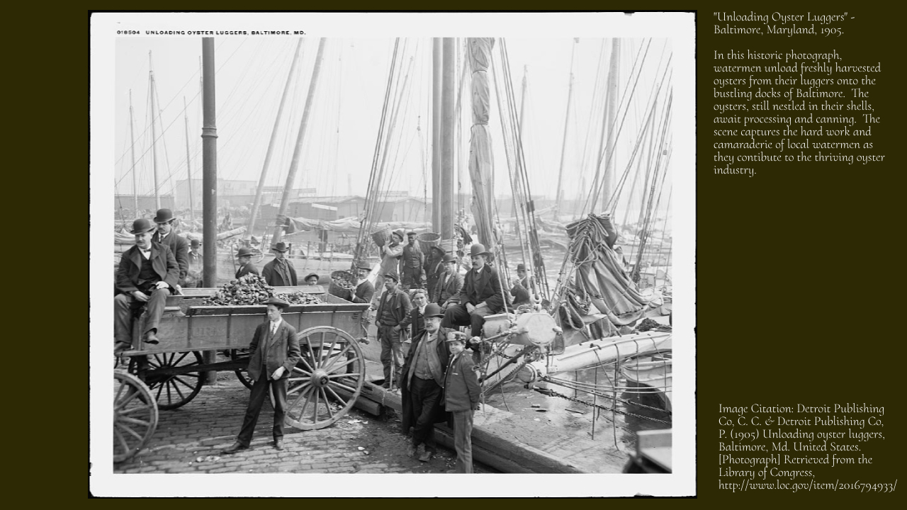 During this time, oysters were being harvested in massive quantities, and as oysters rely heavily on the presence of the previous generation for reproduction, overharvesting and disease caused population decline, forcing oystermen to travel farther and farther to seek out new beds.