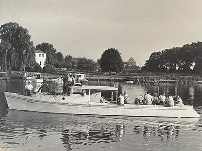 BELOW: Boats that once served watermen in their daily labor were repurposed and adapted for a new role: hosting fishing charters. Pictured is Capt. Toby Welch taking a party fishing out of Gus Berlitz's pier, circa 1954.