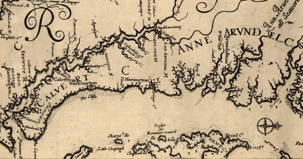 BELOW: A detail of Augustine Herrman's 1673 map shows the colonial port of Herrington, now known as the area called "Town Point." In the vicinity is Herring Creek, the southern branch of which would later be referred to as "Tracy's Creek." "Gott's Creek," now known as "Rockhold Creek" branches off to the north. The exact time when the names were altered is not known.